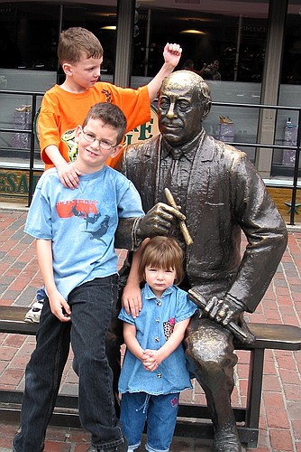 At Faneuil Hall in Boston, Jennifer tries to confirm that Red Auerbach is indeed a statue. Friday, May 17, 2002 CRW_1349 Picture 20 of 34 © Mark E. Siegel