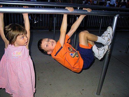 At Hershey Park, Jay and Jen use the railing as a Jungle Gym. Wednesday, July 10, 2002 CRW_1686 Picture 5 of 30 © Mark E. Siegel