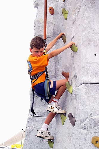 Jennifer contemplates his next move on the climbing wall Saturday, July 27, 2002 CRW_1841 Picture 24 of 30 © Mark E. Siegel