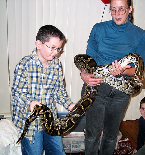 At his birthday party, Joe tries to help handle the snake Sunday, December 15, 2002 CRW_2748 Picture 14 of 18 © Mark E. Siegel
