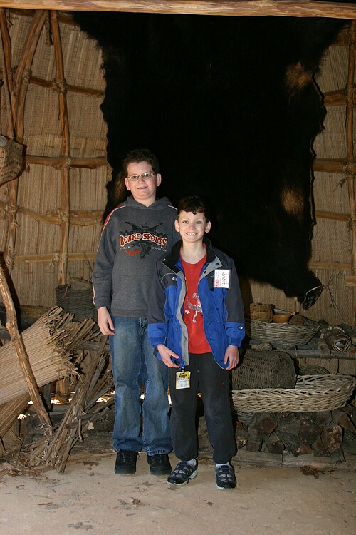 The boys pose in a hut